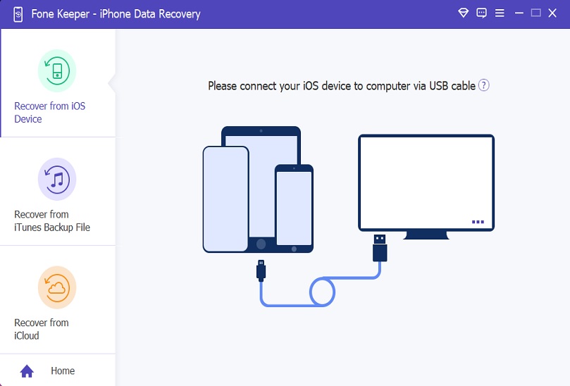Start by launching the iPhone Data Recovery tool and pick your preferred recovery mode. Next, attach your iPhone to the computer using a USB cable.