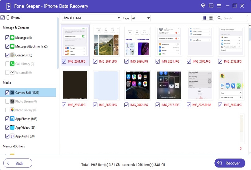 In the preview panel, select the specific data types you wish to restore. Once chosen, click "Recover" to begin the recovery process instantly.