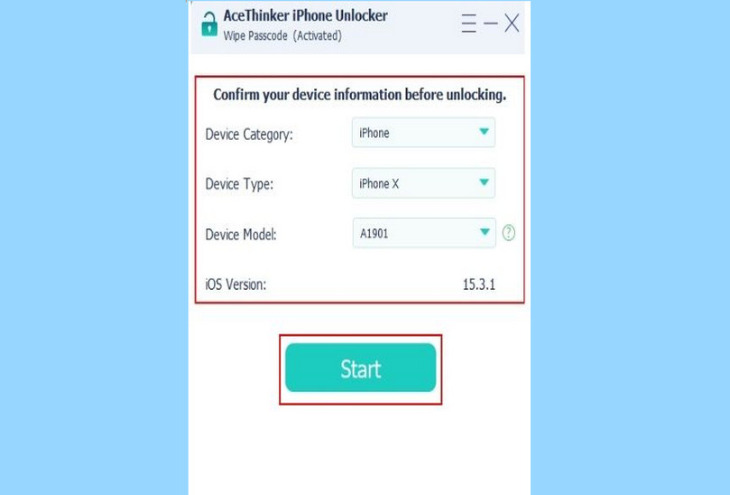 The unlocker scans your iPhone and shows its specs. Verify or adjust them before starting to download the correct firmware for your device.
