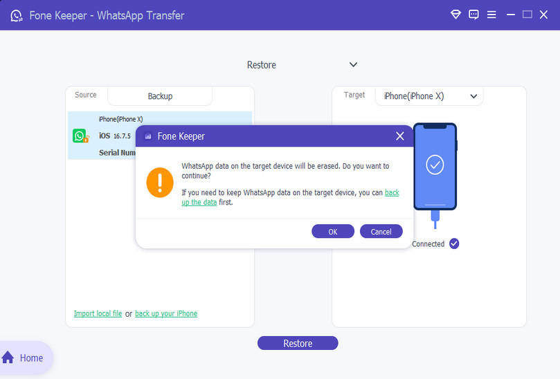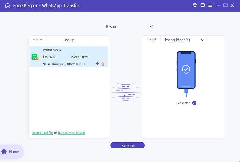 Once connected, click "Restore" to begin. The process only takes minutes, depending on your backup file size.